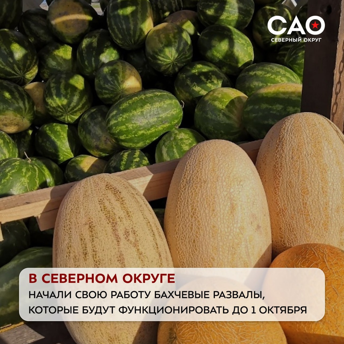 В Северном округе начали свою работу бахчевые развалы, которые будут функционировать до 1 октября. Все точки продажи арбузов и дынь оформлены в одном стиле — характерные коричнево-бежевые палатки с полосатым рисунком создадут атмосферу праздника!
