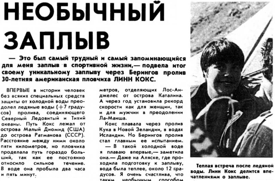 Реально ли вплавь добраться из США в Россию (ну или наоборот)? Седьмого августа 1987 года – это стало реальностью! Американская спортсменка Линн Кокс (известная пловчиха на длинные дистанции) сделала это. Но есть нюанс...