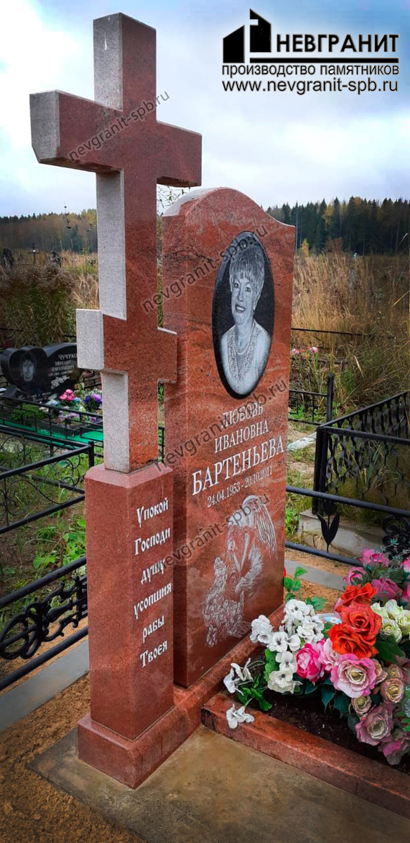 На фотографии запечатлен элегантный и трогательный памятник, посвященный памяти Любови Ивановны Бартеньевой (24.04.1953 - 20.10.2017). Созданный компанией "Невгранит" (www.nevgranit-spb.ru), этот монумент сочетает в себе христианские символы и личные детали, отражающие светлый образ ушедшей. Дизайн и Композиция: Памятник состоит из нескольких основных элементов, гармонично объединенных в единое целое: • Крест: Крупный, отчетливо выраженный крест, выполненный из сочетания красного и серого гранита. Вертикальная часть креста выполняет функцию подставки для боковой части. • Стела: Вертикальная плита из красного гранита с округлым верхом. На стеле расположены: • Овальный портрет Любови Ивановны, запечатленной с улыбкой. • Имя, отчество, фамилия и даты жизни. • Изображение ангела, скорбящего над могилой. • Подставка: Основание памятника выполнено из красного гранита. На подставке выгравированы слова: "Упокой Господи душу усопшия рабы Твоей". Материалы и Исполнение: Памятник выполне