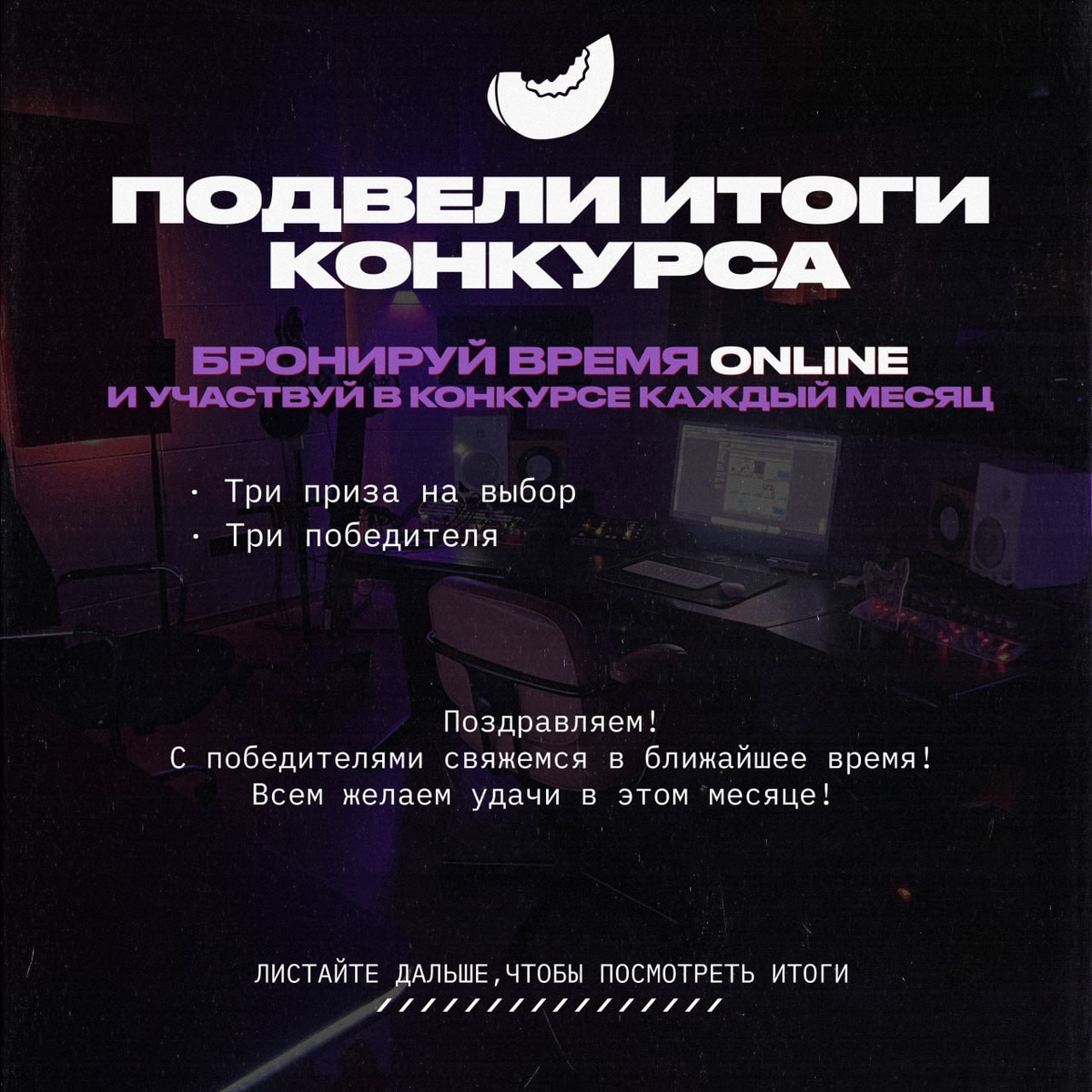 Подвели результаты конкурса за Июль среди забронировавших студию онлайн Поздравляем! С победителями свяжемся в ближайшее время! Всем желаем удачи в этом месяце! 🍈🙏🏻 Для участия, бронируйте время на студии онлайн - 3 победителя каждый месяц; - 3 подарка на выбор.