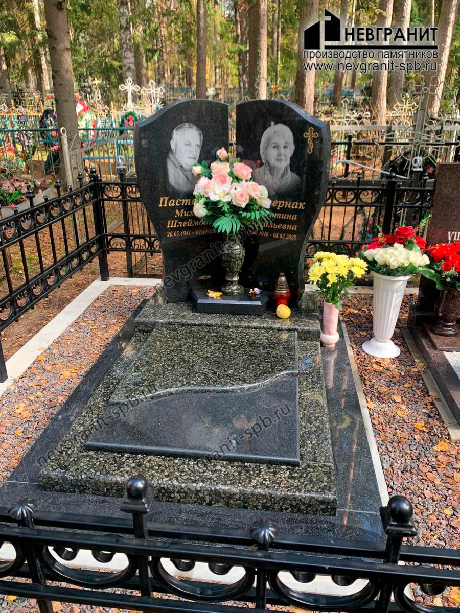 На фотографии представлен достойный и трогательный памятник. Этот памятник, созданный компанией "Невгранит" (www.nevgranit-spb.ru), является свидетельством вечной любви и уважения к ушедшим супругам. Дизайн и Композиция: Памятник представляет собой мемориальный комплекс, включающий в себя: • Две Стелы: Две отдельные стелы из черного гранита, расположенные рядом друг с другом. Каждая стела посвящена одному из супругов. Верхняя часть стел имеет вырезы и закругления, что придает им изящество. На каждой стеле выгравированы: • Портрет усопшего. • Имя, отчество и фамилия. • Даты жизни. • Христианский крест (на стеле Берты Ильевны). • Подставка под Цветы: Небольшая подставка из черного гранита, расположенная между стелами, для установки вазы с цветами. • Надгробная Плита: Горизонтальная плита из гранита с зернистой структурой, закрывающая могилу. • Основание: Плита, также из зернистого гранита, на которой установлена надгробная плита. • Ограждение: Вокруг захоронения установлено мет