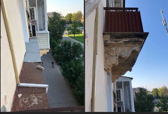 Отвалился приличный кусок бетонной плиты прямо над входом в магазин. Великое счастье что никого в этот момент не было! Могло просто убить человека!!!! Нужна программа по реконструкции балконов и лепнины на сталинках пока не случились трагедии…..
