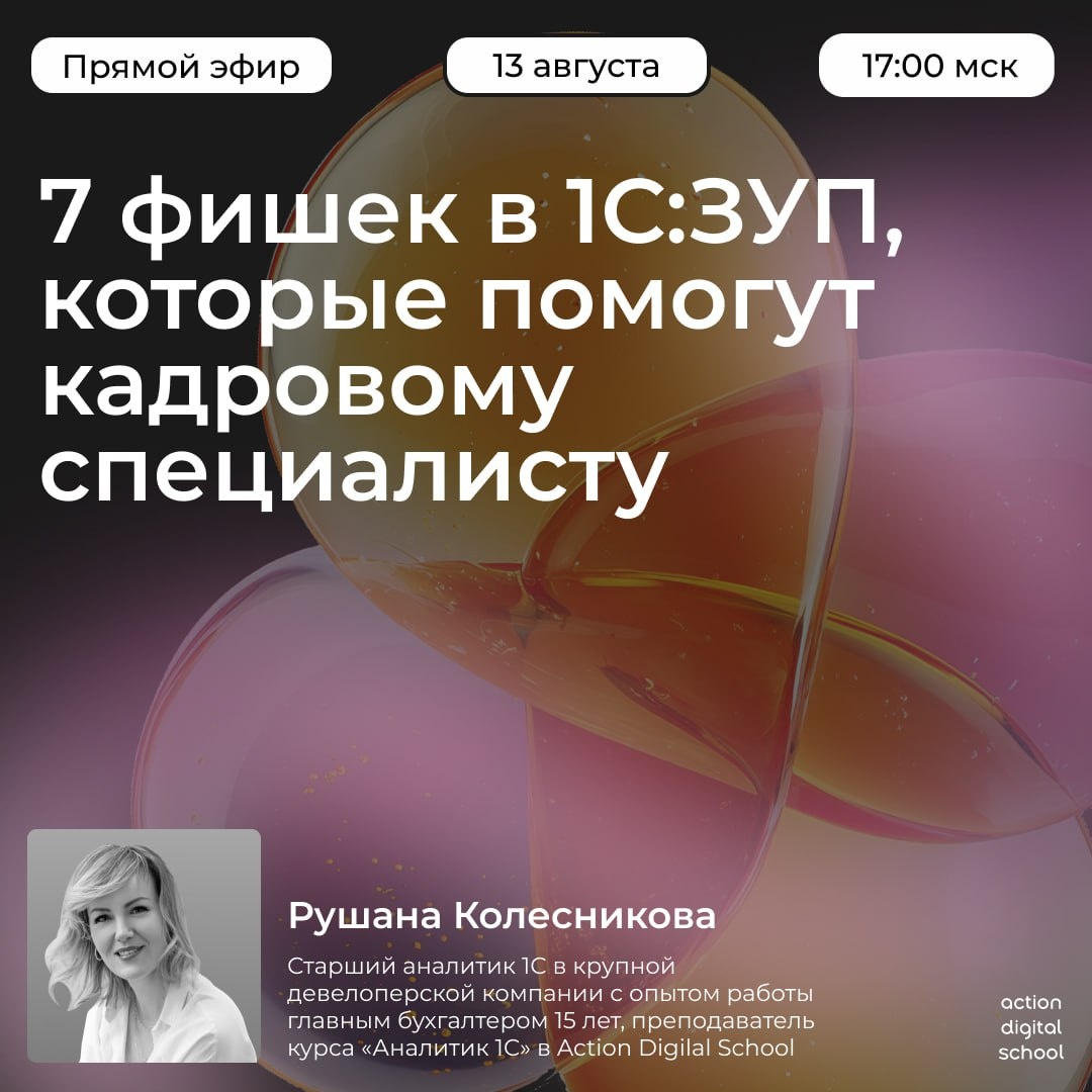 📹 Приглашаем на вебинар «7 мощных фишек в 1С:ЗУП для кадрового специалиста» 🗓 Когда: среда, 13 августа ⏰ Во сколько: 17:00 мск 📍 Где: онлайн Спикер — Рушана Колесникова, старший аналитик 1С в крупной девелоперской компании, преподаватель курса «Аналитик 1С» в Action Digital School. На вебинаре вы научитесь: 💗Настраивать интерфейс 1С: ЗУП под себя: корректировать настройки панели и скрывать ненужное 💗Организовывать быстрый доступ к избранным действиям и настраивать удобную навигацию в программе 1С 💗Устанавливать автонапоминания: контролировать важные события без лишних усилий 💗Формировать готовые отчеты и получать шаблоны для аналитики в один клик 💞 Все участники получат шпаргалку «Горячие клавиши для работы в 1С для специалистов по кадрам» Регистрация на вебинар 👈