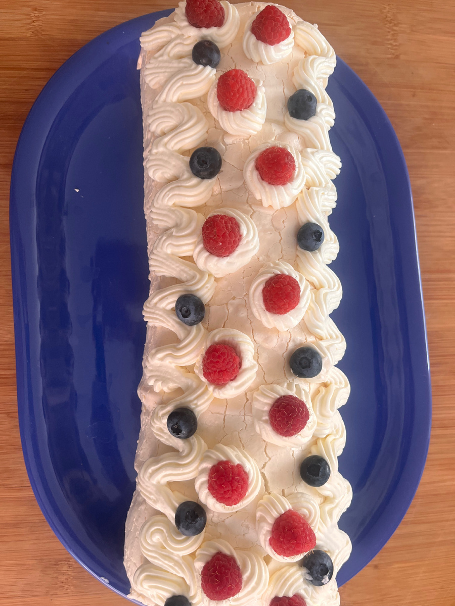 Аккуратно, с помощью пергамента, сверните меренгу в плотный рулет.
