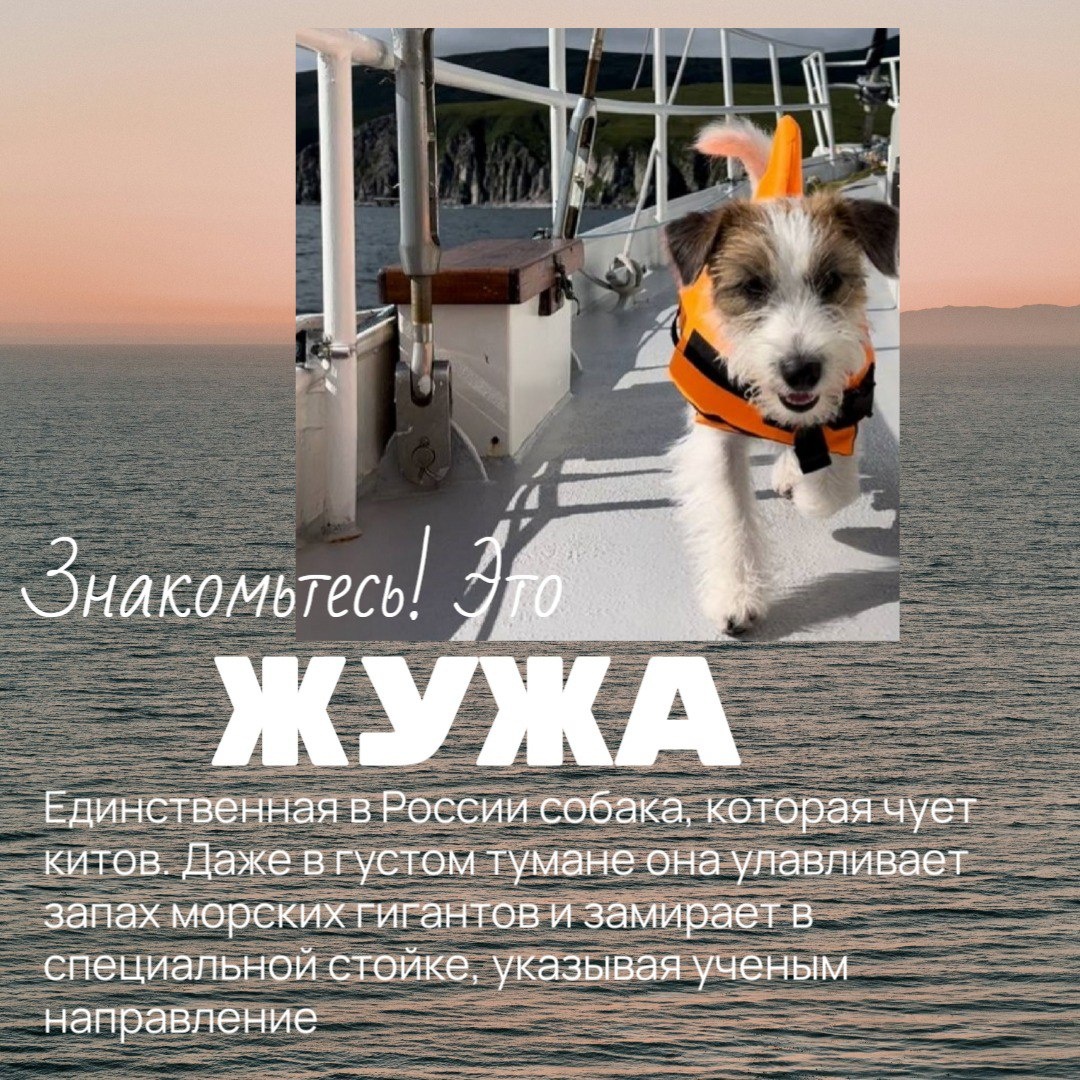 В России проходит уникальный эксперимент: джек-рассел-терьер по кличке Жужа учится искать китов по запаху. Проект реализуется фондом «Природа и люди». Он организует экспедиции, изучает редкие виды животных, развивает экологическое образование и реализует природоохранные проекты, направленные на сохранение ценных экосистем и редких видов животных и растений. Впервые Жужа отправилась в море в 2024 году. Тогда она стала полноправным членом экспедиции в заливе Шелихова Охотского моря. Жужа четко реагировала на появление китообразных. Каждый раз при приближении крупных морских обитателей собака громко лаяла, обращая на них внимание людей. «Мы показали ей морских свиней, которые близко подходили к яхте. И впоследствии она сама, работая носом, высматривала и вынюхивала животных вокруг. Как первый этап обучения это очень хороший результат», — рассказала хозяйка Жужи и младший научный сотрудник ИПЭЭ РАН Юлия Ганицкая. В этом году команда отправилась к Баренцеву морю, где обитают краснокнижны