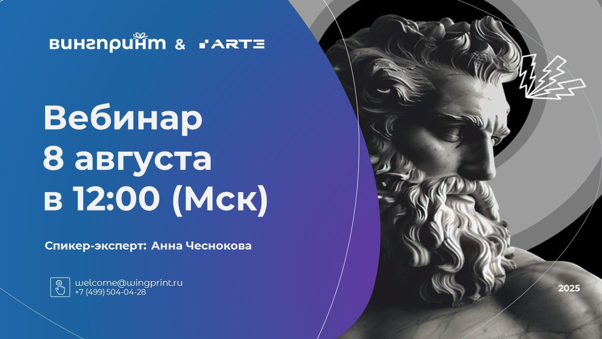 Вебинар Винг Принт со спикером от Артэ Гифтс! Приглашаем вас на уникальный вебинар от компании Винг Принт! Уже в эту пятницу 8 августа Вы откроете новые горизонты в мире бизнес-продукции и подарков с эксклюзивной презентацией от Арте Гифтс. Спикер-эксперт: Чеснокова Анна Мы продемонстрируем актуальные новинки и бестселлеры. Что вас ждет: 🔹 Обзор новинок и популярных товаров. 🔹 Ответы на ваши вопросы от опытного спикера. 🔹 Возможность близкого знакомства с товарами. Специальные предложения: ✔️ Приз победителю мини-викторины. ✔️ Эксклюзивные скидки для участников. Не упустите шанс расширить свои знания и сделать выгодные покупки! Для подключения переходите по ссылке https://wingprint.ktalk.ru/c4t5snxondie Для участия вам потребуется PIN-код, который получат все наши email-подписчики. Подписывайтесь, чтобы быть в курсе всех новостей и участвовать в акциях и вебинарах! До встречи на вебинаре! пишите на ✉️ welcome@wingprint.ru звоните по ☎️ +7 (499) 504-04-28