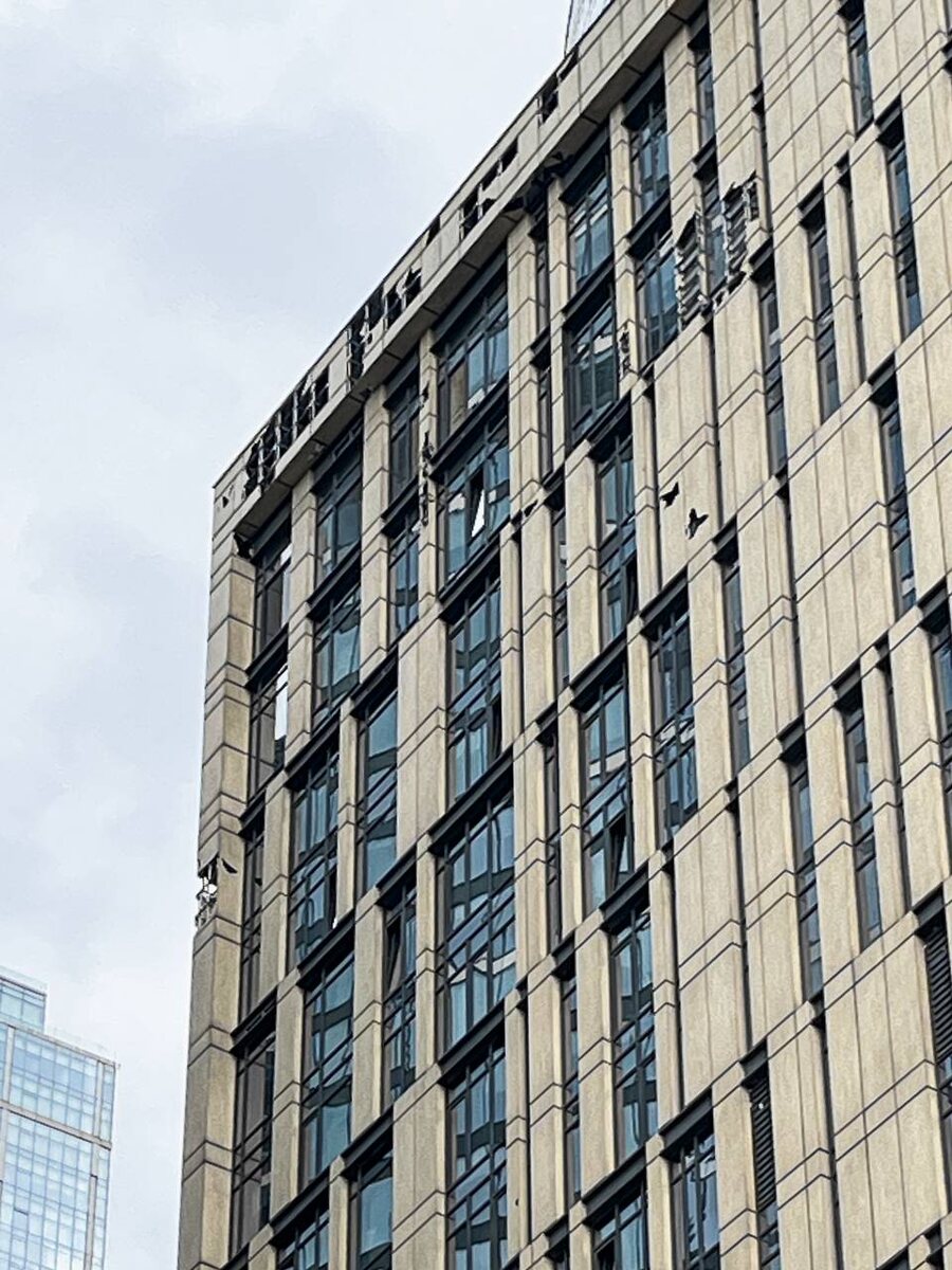 На фасадах жилого корпуса, входящего в состав комплекса «IQ-Квартал», всё также продолжают зиять дыры, образованные атакой беспилотного летательного аппарата в июле 2023 года.