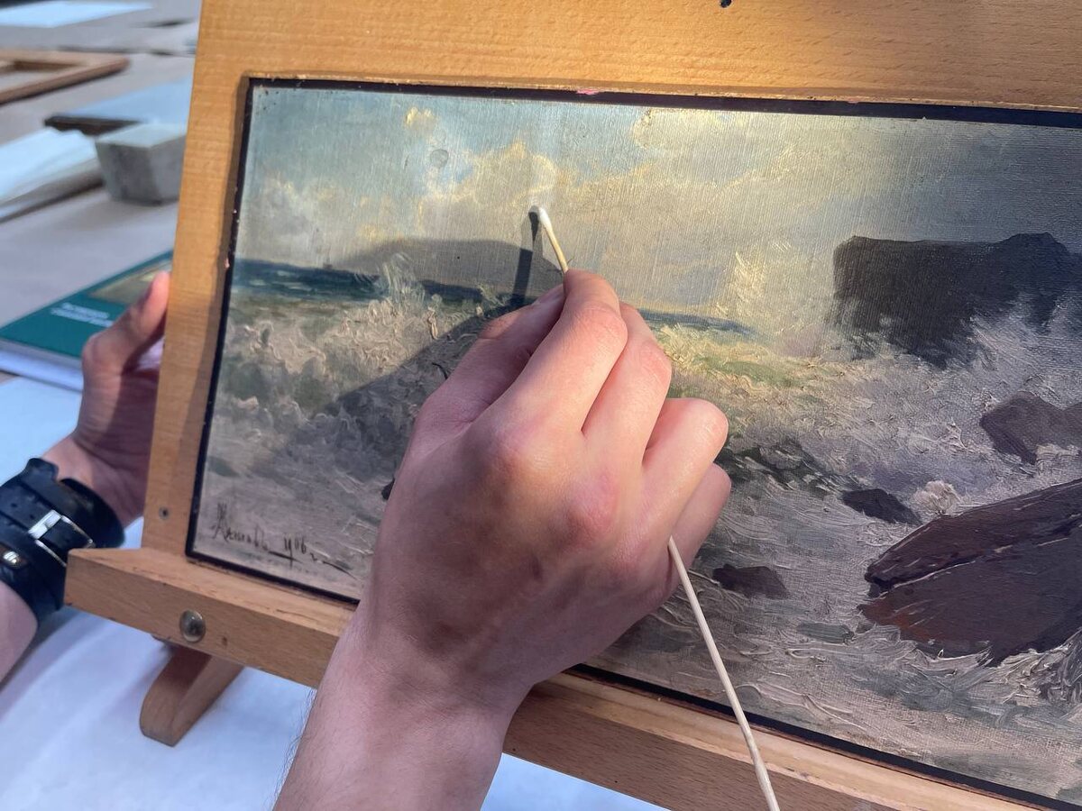 🔹 Одна из наиболее сложных с точки зрения реставрации – «Прибой у скалистого берега» кисти Михаила Алисова. До реставрации вся поверхность полотна была покрыта сильными загрязнениями, въевшимися в пожелтевший лак. Они искажали авторский колорит и нарушали художественную целостность произведения.