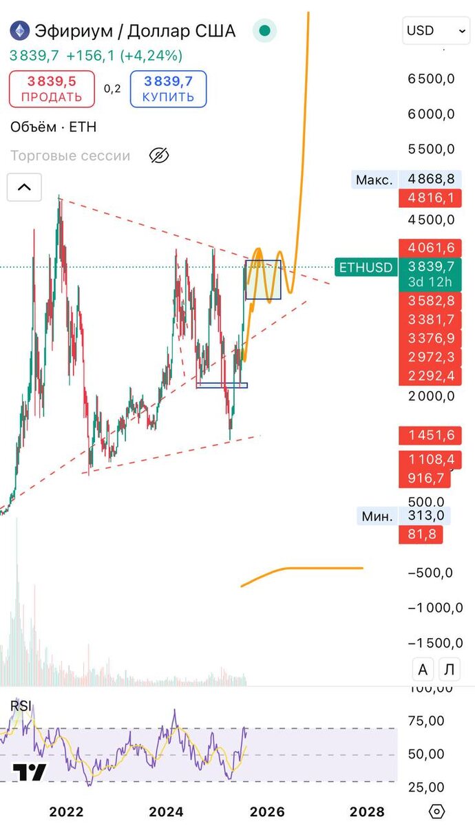 Интересный момент в крипте. После достижения битком BTCUSD 120 тыс, и консолидации под этой ценой, есть все шансы на «продолжение банкета». При этом, ETHUSDT выполнил нашу базовую цель 🎯 (верхняя граница ДПЗ, почти 50% за июль), причем смотрится «эфир» сильно лучше в последнее время, а криптаны ставят на его рост, затариваются даже институционалы, что подкрепляет технически мощный тренд. Как думаете, где увидим его в этом году? 👇👇👇