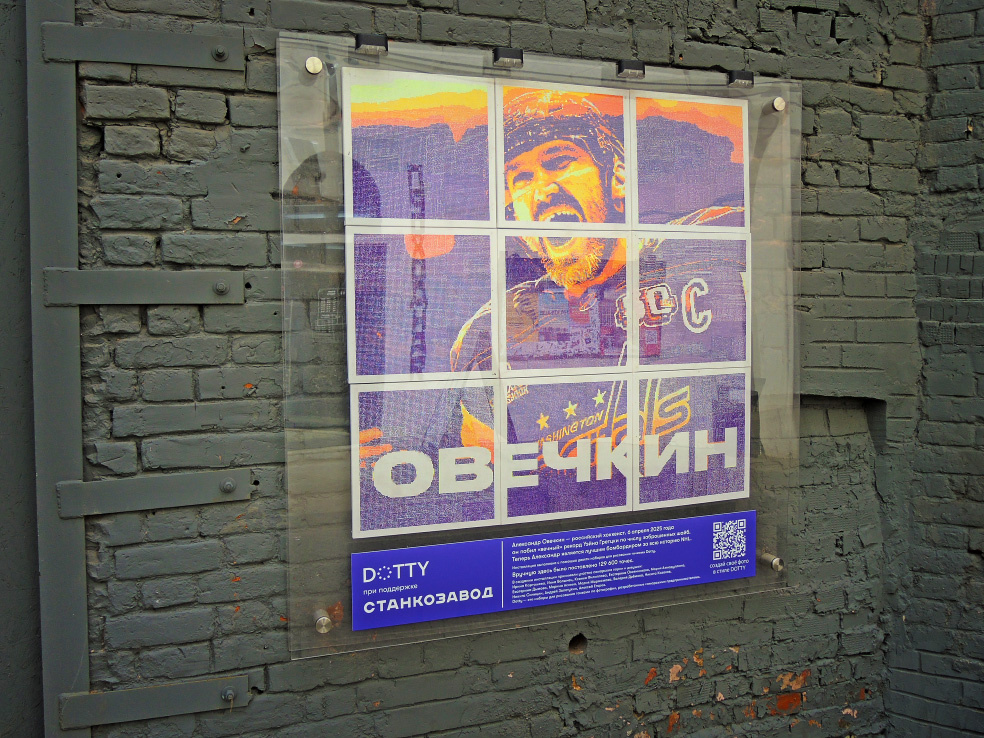 В поисках новых арт-объектов в Самаре во время недавней прогулки по историческому центру города решил заглянуть в творческое пространство «Станкозавод». О нём я уже рассказывал раньше, повторяться не буду. В этот раз просто шёл мимо и завернул посмотреть, не появилось ли чего нового. Оказалось, новое появилось. В мае 2025 года во дворе появился объект, посвящённый установлению нового рекорда по забитым шайбам в играх НХЛ Александром Овечкиным. Объект представляет собственно портрет хоккеиста. Выполнен он с помощью наборов для рисования Dotty. Это разработка самарских программистов. Основа проекта - онлайн алгоритм, позволяющий превратить любую фотографию в схему для рисования в технике пуантилизм. То есть изображение создаётся при помощи нанесения большого количества точек. В случае с Dotty для этого используются маркеры. Как пишут в легенде объекта, для его создания было нанесено 129 600 точек вручную. На мой взгляд, хорошая реклама для проекта. Больше ничего нового масштабного на гла