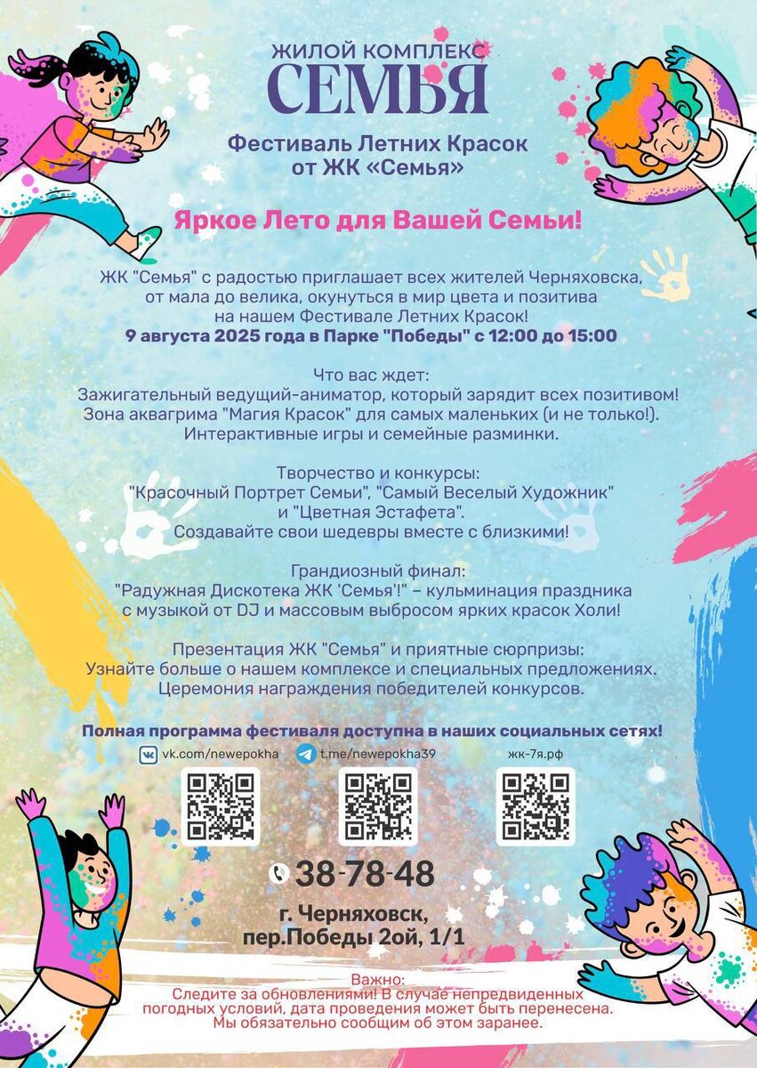 В субботу в Черняховске состоится фестиваль летнего настроения. ⠀ Праздник пройдёт в парке Победы. Программа насыщенная: ⠀ 🔹ведущий-аниматор, 🔹зона аквагрима «Магия красок», 🔹интерактивы и семейные зарядки, 🔹творчество и конкурсы: «Красочный портрет семьи»,«Самый весёлый художник», «Цветная эстафета». ⠀ 🎉 Финал праздника: дискотека «Радуга красок» с DJ и взрывом красок Холи. ⠀ 🏆 Главный приз — сертификат на 300 000 рублей, который можно использовать на покупку недвижимости в ЖК «Семья». ⠀ 📅 9 августа 📍 Парк Победы с 12:00 до 15:00 0+