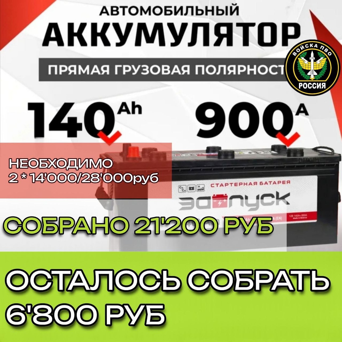 Добрый вечер, тыловики. Спасибо всем вам за ежедневную поддержку бойцов на сво. Продолжим сбор на АВТОМОБИЛЬНЫЕ АККУМУЛЯТОРЫ ДЛЯ ПВО: 📌Сумма к сбору - 28'000 руб. 🔺Собрано - 21'200 руб. 🔺Осталось собрать - 6'800 руб. Осталось совсем немного. Поднажмём-закроем сбор прями сегодня! 🙏 Переведём любую посильную сумму на на номер карты 💳2202208188194204 или по номеру телефона 📞+79530562233 Получатель - Светлана Владимировна Л. ("Сбербанк") #уралсвоихнебросает #вместемысила