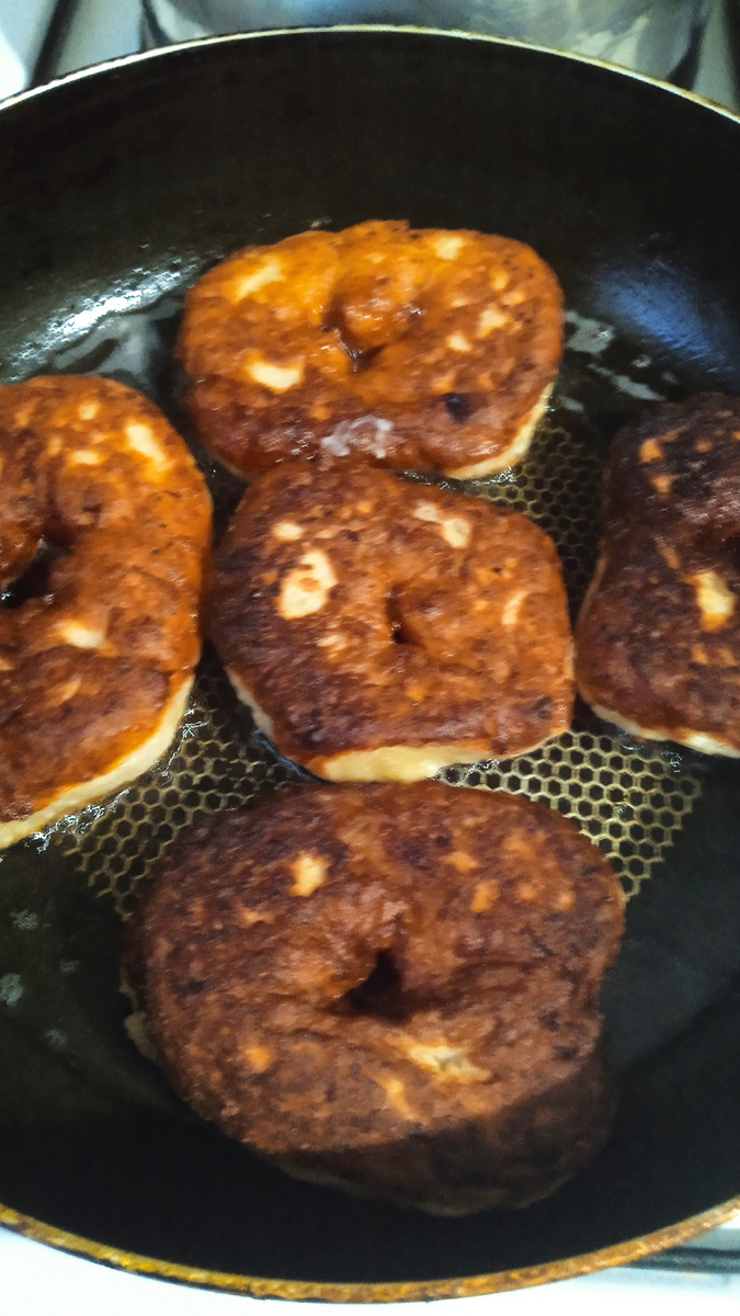 Примерно так как на фото. Дать тесту растояться. Далее нагреваем в сковороде растительное масло( масло или жиры должно быть много, чтоб плюшки плавали), и обжариваем наши плюшки с двух сторон до готовности. Желаю всем приятного аппетита и хорошего настроения🌺🌺🌺🌺🌺