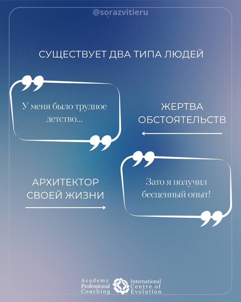 НО Ваше прошлое – это не приговор! Это отправная точка для создания лучшего будущего. Начните свой путь к трансформации прямо сейчас! 🗝️ Ключи к трансформации, которые вы можете использовать прямо сейчас: • Переосмысление: не отрицайте боль, но не позволяйте ей определять ваше будущее. • Благодарность за уроки: даже в самых сложных ситуациях можно найти ценный опыт. • Фокус на будущем: Направляйте свою энергию на создание жизни, которую вы хотите. • Профессиональная помощь: Терапия – мощный инструмент для исцеления и личностного роста. 🌟Помните: прошлое не определяет ваше будущее. Выбор за вами! Подробнее о семейных сценариях и запись на тренинг в статье https://vk.com/@sorazvitieru-kak-ponyat-chto-u-vas-est-scenarii