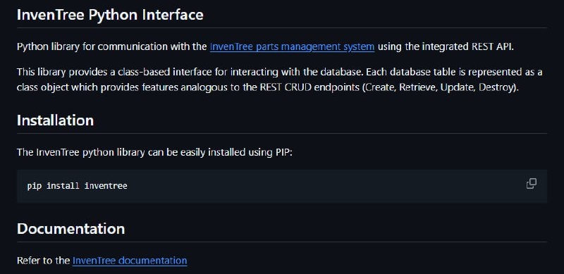 📦 InvenTree – это управления складом и номенклатурой, построенная на Python /Django и предоставляющая полный REST API как для веб-интерфейса, так и для внешних интеграций. Основные возможности: 🔵Автоматическая аутентификация через токены или логин/пароль. 🔵Получение и фильтрация данных через удобные методы. 🔵Создание, обновление и удаление объектов (CRUD). 🔵Работа с объектами склада и запасами. 🔵Управление деталями, категориями, локациями и BOM. 🔵Прикрепление файлов и добавление параметров к объектам. 🔵Перезагрузка и синхронизация данных. 🔵Простая интеграция с REST API сервера InvenTree. ➡️Установка: pip install inventree 📱 Репозиторий ⚙️ Документация ➡️Справочник Программиста. Подписаться