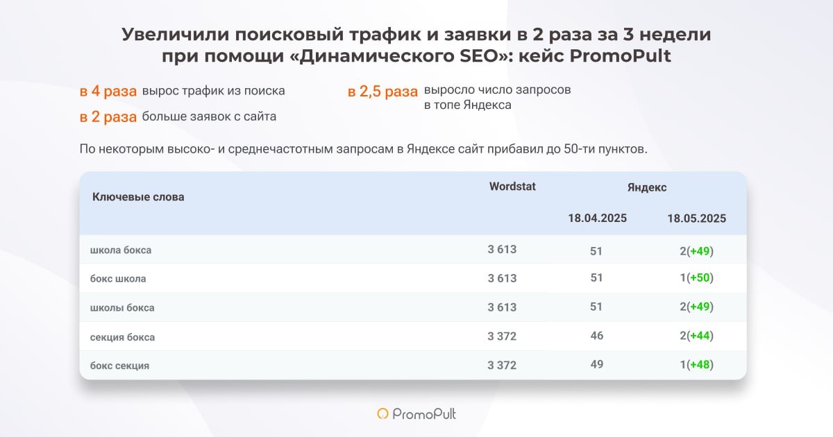 Чтобы получить результат от SEO, нужно на первом этапе собрать полное и релевантное семантическое ядро. Казалось бы, это азбучная истина. Но как владельцу сайта понять, какие запросы эффективны, а какие нет — погружаться в аналитику, нанимать штатного SEO-специалиста, обращаться в агентство? Для малого бизнеса есть вариант дешевле и продуктивнее — подключить «Динамическое SEO» в PromoPult. Здесь семантику собирают и анализируют AI-алгоритмы, а сайт продвигается по фразам, которые принесут прирост трафика и конверсий. Коллеги из PromoPult делятся результатами продвижения сайта боксёрского клуба, которому за 3 недели удалось в 2 раза увеличить поисковый трафик и заявки при помощи «Динамического SEO».