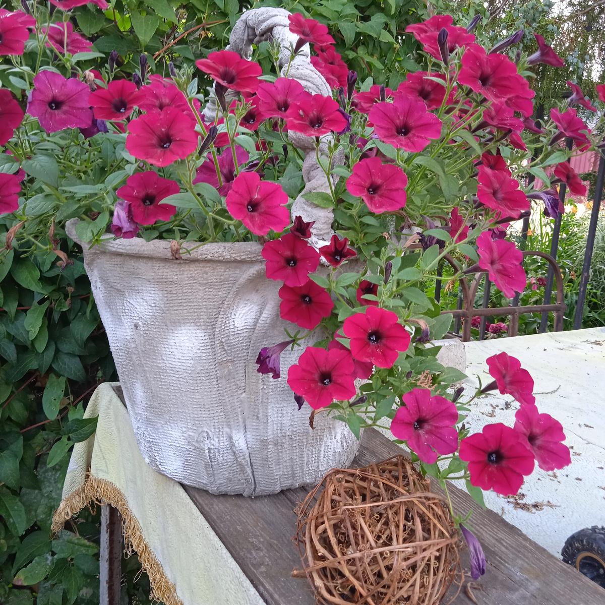 Да еще надо сделать так, чтобы меньше забот и хлопот у меня было, чай не девочка! Всю голову изломала, что мне делать с огромным металлическим столом, который стоит сразу у входа во двор. Когда-то он стоял у соседского забора на улице, дед там работал с цементом, отливал бордюры. Потом я его маскировала различными растениями. Но сосед стал менять забор и попросил стол убрать. Ничего умнее не придумав, затащили и поставили во двор, якобы временно Но мы -то знаем, что временно, означает навсегда. Я и просила и ругалась, чтобы убрали это стращилище, но воз и ныне там. Тогда я стала искать выход, как его окультурить, раз уж мне с ним жить. Когда Света " Дачная авантюристка"сделала свой стол-тарелку, я тоже решила, что это выход, и я так сделаю. Но для этого надо было отпилить высокие ножки. Дед уперся рогом. Что? Стол испортить! и ТД и ТП. Спорить, себе дороже! Тогда застелила я ржавый стол старым свекровиным покрывалом и поставила кашпо с цветами. Но мысль работала постоянно, что же м