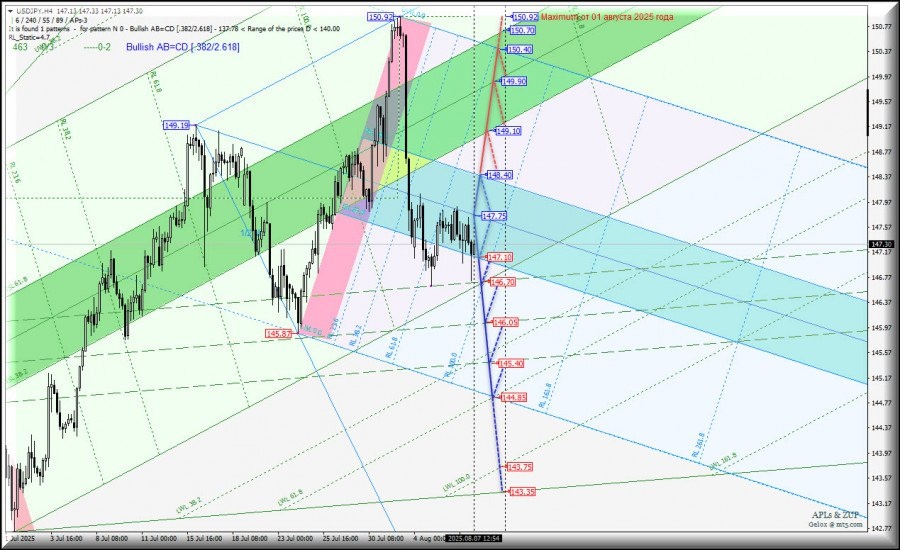 https://basechop.ru/wordpress/?p=53032 Операционный масштаб Minute (таймфрейм h4) USD/JPY – h4 – обзор вариантов движения с 08 августа 2025 г. Предыдущий обзор US Dollar vs Japanese Yen (таймфрейм Daily) от 31.07.2025 г. 11:29 ____________________ US Dollar vs Japanese Yen Валюта “страны восходящего солнца” – USD/JPY-h4 – с 08 августа 2025 года продолжит свое движение исходя из отработки и направления пробоя границ зоны равновесия (147.10 – 147.75 – 148.40) вил младшего операционного масштаба Minuette-h1. Восходящее движение. При пробое срединной линии Median Line Minuette-h4 (уровень сопротивления 147.75) движение USD/JPY продолжится к верхней границе ISL38.2 (148.40) зоны равновесия вил младшего операционного масштаба Minuette-h1 при пробое которой далее движение этой валютной пары продолжится к зоне равновесия (149.10 – 149.90 – 150.70) вил старшего операционного масштаба Minute-h4. Нисходящее движение. Если состоится пробой нижней границы ISL61.8 (уровень поддержки 147.1