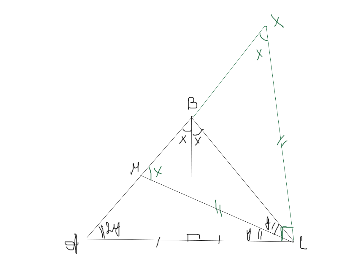 В равнобедренном треугольнике ABC (AB=BC) биссектриса BL в два раза короче биссектрисы CM. Найдите ∠ABC. Биссектриса из вершины равнобедренного треугольника есть и высота и медиана. Значит, если продлить АВ до пересечения с параллельной BL прямой СХ, то BL станет средней линией треугольника АХС. И вот совпадение - ХС в 2 раза больше BL, как и СМ. Выходит, СМХ равнобедренный треугольник. Разбираемся с равными углами. в итоге можем записать 2х+4у=180 (для АВС) 2х+90-у=180 (для СМХ) 2х+4у=2х+90-у 5у=90 у=18 Угол АВС= 180-4*18=108 Ответ 108 Другие задачи раздела