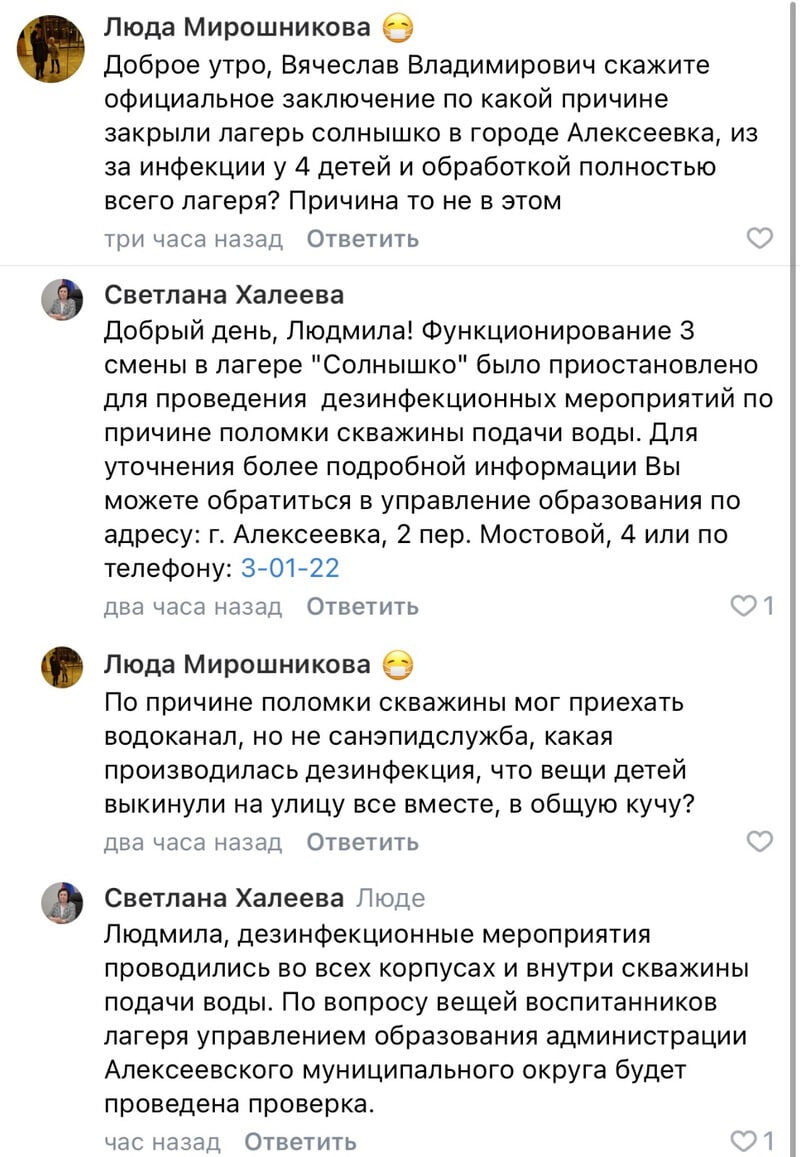 В ответ на пост Загородный лагерь в Алексеевском округе, где заболели четверо детей, временно закрыт Загородный лагерь «Солнышко» в Алексеевке, где в конце июля у четверых детей выявили признаки инфекционного заболевания, временно закрыт. Об этом сообщила глава администрации Алексеевского округа Светлана Халеева, отвечая на вопрос о ситуации в лагере на странице губернатора в соцсетях. По словам чиновницы, работа смены была приостановлена для проведения дезинфекционных мероприятий из-за поломки скважины подачи воды. Санитарная обработка выполнена во всех корпусах, а также в самой скважине. Мать одного из отдыхающих в лагере школьников сообщила, что у детей даже не было возможности забрать свои вещи, которые в срочном порядке были выброшены на улицу в одну кучу. Светлана Халеева заявила, что муниципальным управлением образования будет проведена проверка. Подписаться на 🗞🗞 | Поддержать бустом