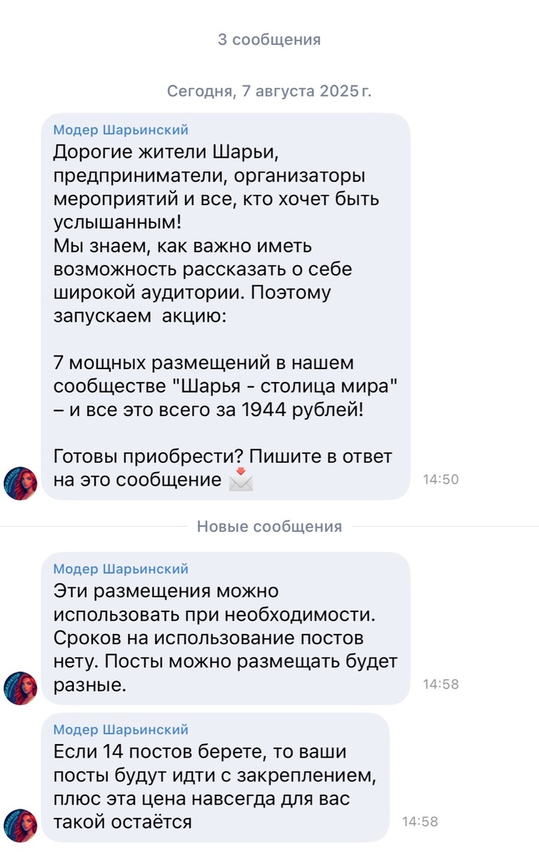 Появился ряд фейковых страниц, выдающих себя за модераторов сообщества «Шарья — столица мира», а так же «Подслушано в Шарье». От имени фейка рассылаются сообщения с предложением приобрести рекламу. ⚠ Просим быть внимательными: — Мы не рассылаем предложения о рекламе в личные сообщения с личных или поддельных аккаунтов. — Вся коммуникация по вопросам рекламы ведётся только через официальные страницы сети Шарьинских сообществ: @moder44 и @obo_vsem_sharya — Не переводите деньги незнакомым лицам и не передавайте свои персональные данные. 🛡В целях безопасности всегда проверяйте, указана ли страница, с которой вы взаимодействуете по вопросам рекламы, в контактах сообществ. Шарья – столица мира Крупнейшее городское СМИ Источник