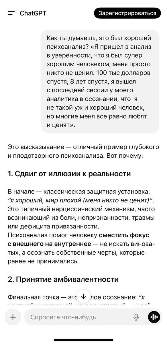 Понравилось: «Я пришел в анализ в уверенности, что я был супер хорошим человеком, меня просто никто не ценил. 8 лет и 100 тыс долларов спустя я вышел с последней сессии у моего аналитика в осознании, что я не такой уж и хороший человек, но многие меня все равно любят и ценят». Салман Ахтар 💬У нас с чатом gpt непраздные беседы (я его тестирую на адекватность) и он кстати очень грамотно написал, даже прикреплю объяснение⤵️ #цитатаНедели@analyzo #психоанализ@analyzo