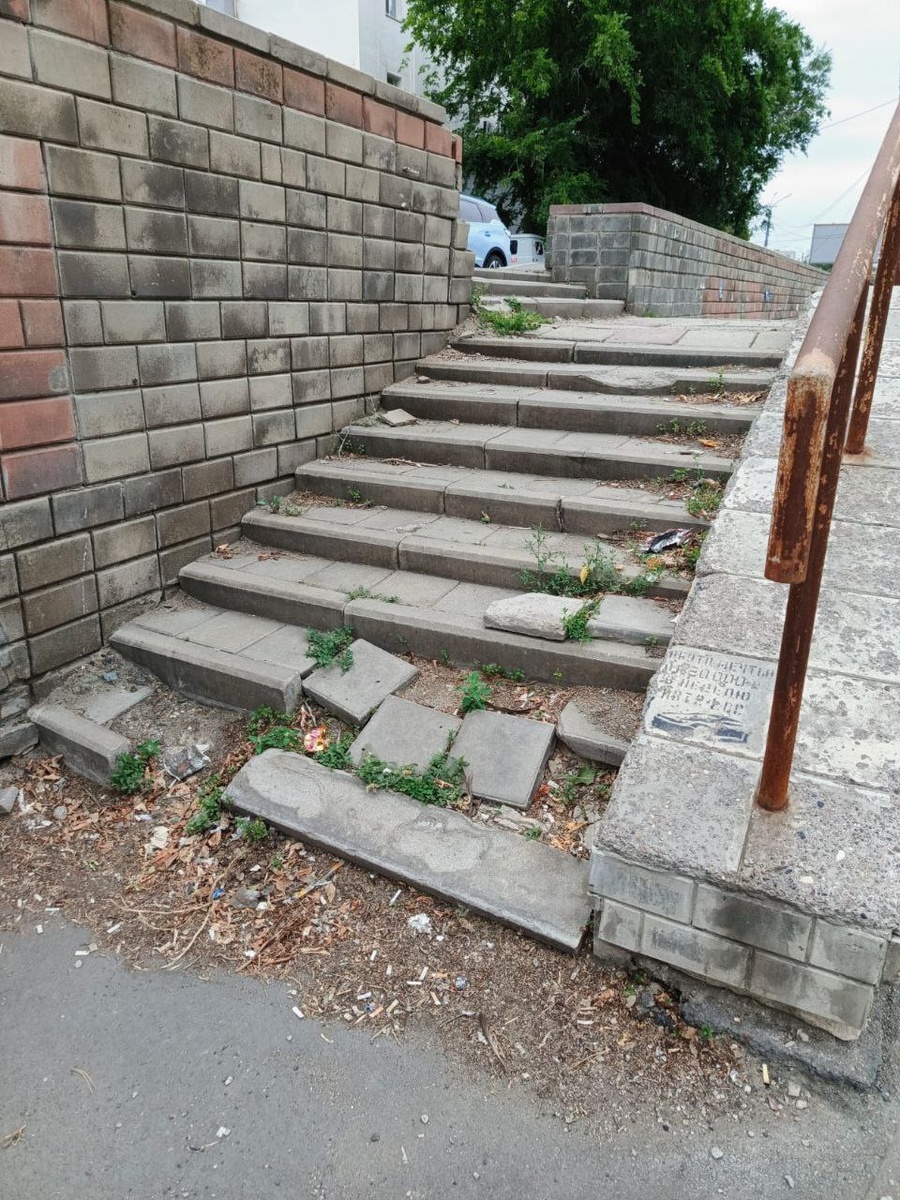 В центре города на улице Терешковой, рядом с домами от 2 по 6 и Городской больницы № 4 вот такое опасное состояние подпорной стены и ступеней к остановке общественного транспорта!