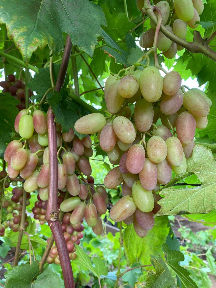 Виктор сегодня. Пока окрашивается. но при желании можно загрызть пару ягод. Через недельку будет самое то! 🔥 Чуть не забыла! Обнаружили в закромах (на самом деле, набрали нужную форму) четыре саженца Виктора. Один уже забрали, но три в наличие, можно заказать. Еще несколько Юбилеев Новочеркасска дошли до нужной кондиций, но тут на выбор - или Виктор, или Юбилей, уж очень похожи.