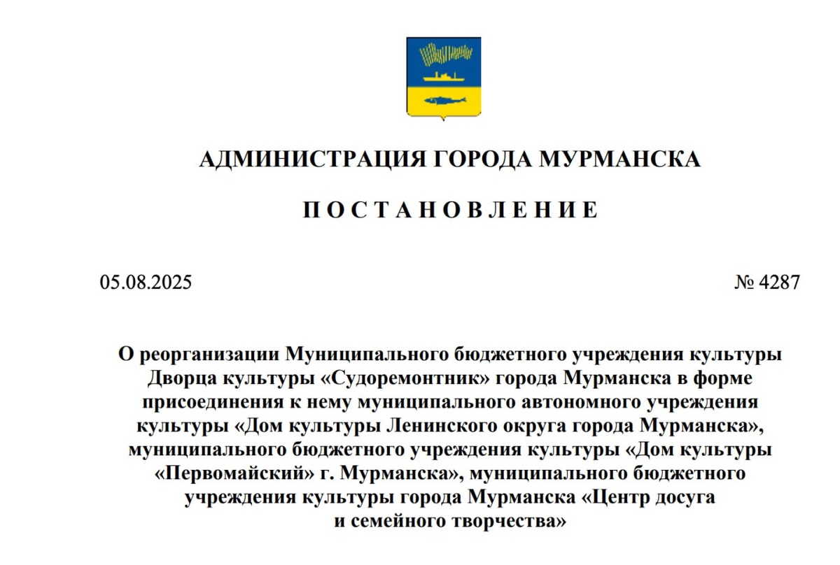 Культуру объединяют: врио мэра Мурманска Иван Лебедев подписал постановление об укрупнении городских учреждений культуры. Согласно постановлению ко Дворцу культуры «Судоремонтник» присоединят «Дом культуры Ленинского округа города Мурманска», «Дом культуры «Первомайский» г. Мурманска» и «Центр досуга и семейного творчества». Функции и полномочия учредителя МБУК ДК «Судоремонтник» будет осуществлять администрация города Мурманска в лице комитета по культуре администрации города Мурманска. ❄ «Арктический Обозреватель»