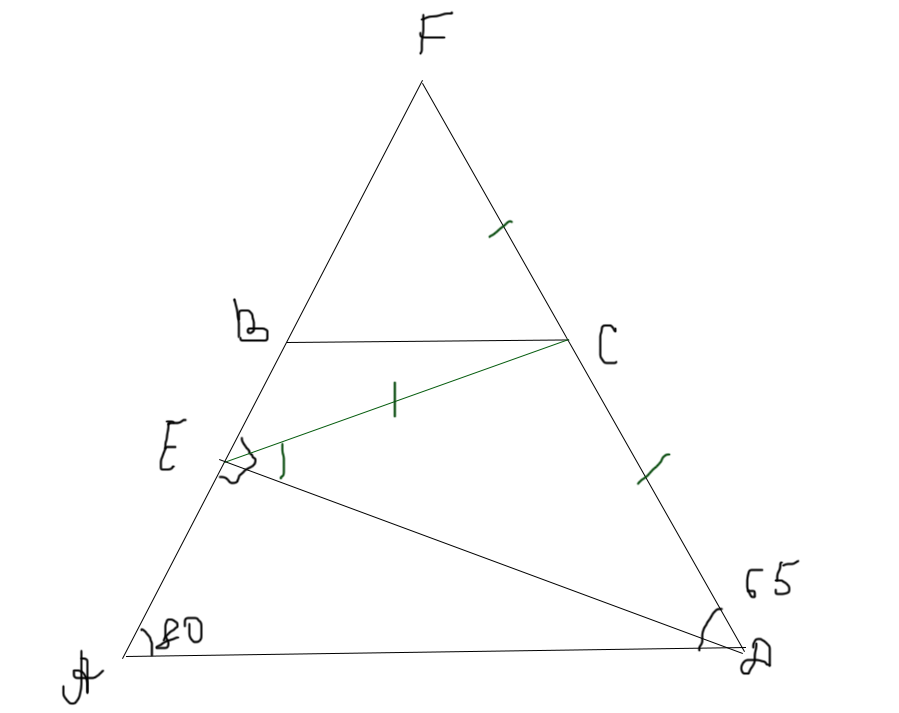 В трапеции ABCD основание BC в два раза меньше основания AD. Из вершины D опущен перпендикуляр DE на сторону AB. Известно, что ∠BAD=80∘, ∠ADC=65∘. Найдите ∠CED. Задача поразительно простая, если хорошо все начертить. Раз у нас одно основание трапеции в 2 раза меньше другого, то не является ли маленькое основание средней линией фантомного треугольника? Теперь у нас есть прямоугольный EFD, в котором ЕС - медиана из прямого угла, которая равна половине FD, как и CD в общем-то. Так мы получили равнобедренный ECD. А угол D у него почти известен - это 65-10 Ответ 55 Точка E — середина медианы AD треугольника ABC. Точка F на стороне AC такова, что DF∥BE. Найдите отношение BE:DF. Тут опять важно начертить. Поскольку ВМ и DF параллельны, и BD=CD, то DF средняя линия треугольника ВМС и равна половине ВМ. Теперь посмотрим на ADF. ЕМ || DF, AE=ED, значит ЕМ средняя линия и равна половине DF. BM=2*DF-1/2*DF=3/2DF Ответ 1.5 Другие задачи раздела