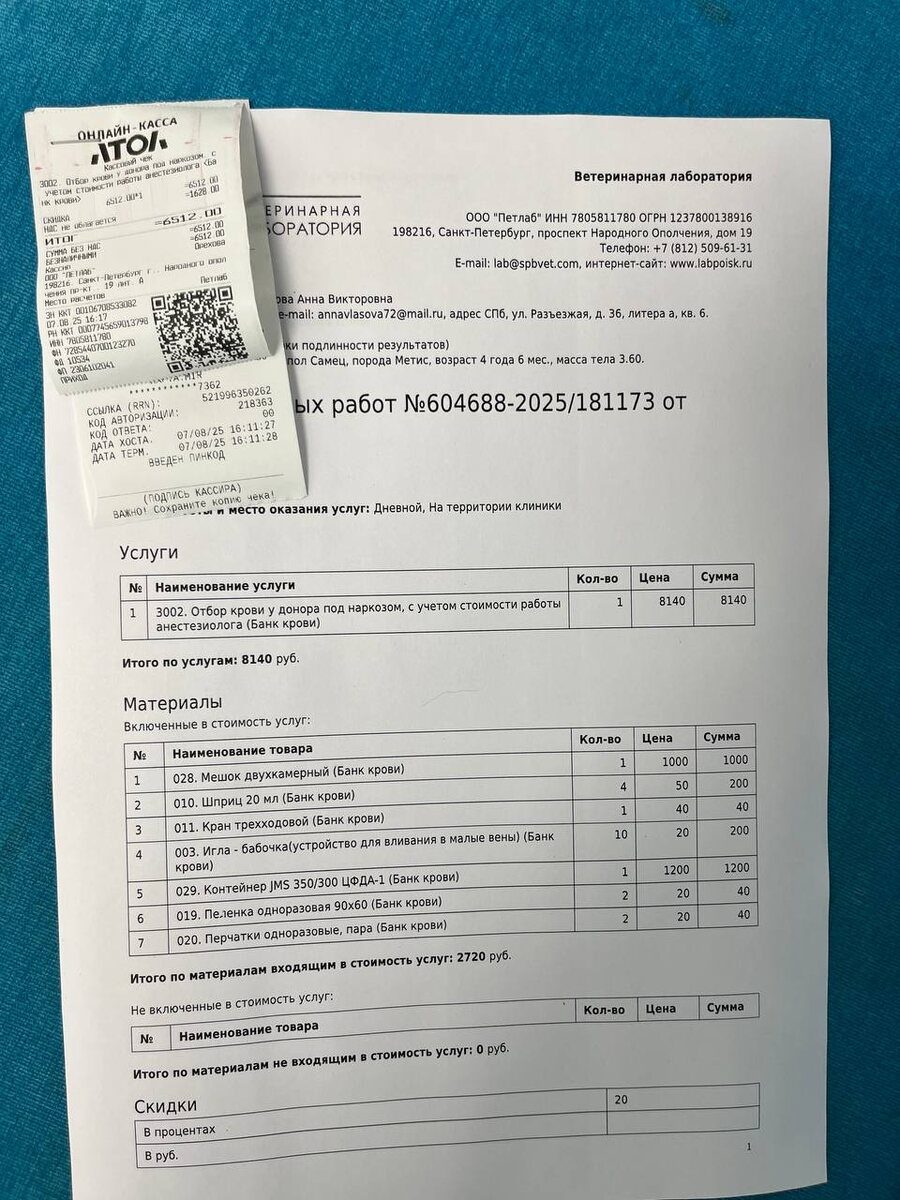 Оплатила за анализы и забор крови у доноров (вчерашний прием Ночка и Шани)