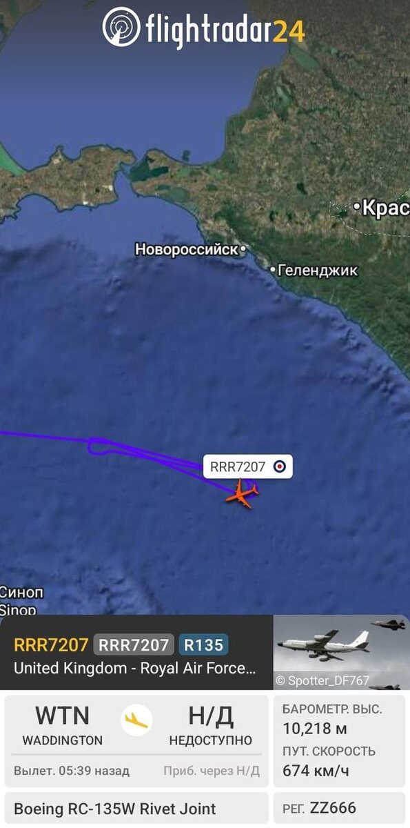 После ночной атаки на г. Новороссийск, у берегов Краснодарского края ведет разведку: 🇬🇧Boeing RC-135W Rivet Joint ВВС Великобритании — стратегический разведывательный самолёт