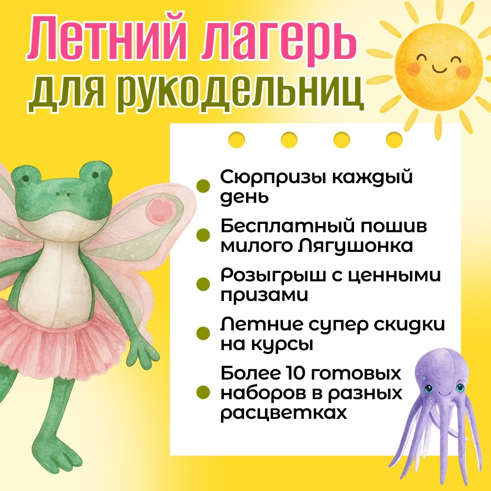 ☀️ Приглашаю тебя в ЛЕТНИЙ ЛАГЕРЬ для РУКОДЕЛЬНИЦ! ☀️ В какой отряд тебя зачислить? 👉 https://mimido.su/lltg - ВЫБИРАЙ Ты тоже заслуживаешь свой кусочек лета в хорошей компании и с любимым хобби! Летний лагерь MimiDo 📅 Когда: с 7 по 29 августа 📍 Где: в нашей группе в ВК и на сайте Школы Хобби MimiDo 💻 Формат: онлайн 🎁 Участие: БЕСПЛАТНОЕ ✔️ ГОТОВЫЕ НАБОРЫ - ЕСТЬ! Вы сможете сшить всё точно как у меня! Включи уведомления от группы, чтобы ничего не пропустить 🔔 Приготовили для вас много подарков: 🎁 пошив летнего Лягушонка 🎁 5 ярких мастер-классов 🎁 летние скидки 🎁 РОЗЫГРЫШ с ценными призами! Для "старших отрядов": ✔️ дополнительные уроки – Лягушечка-девочка ✔️ дополнительные варианты наборов ✔️ все уроки пошива в записи с доступом до 18 месяцев КАК получить ВСЁ - узнай по ссылке: 👉 https://mimido.su/lltg - перейди и узнай подробнее! Первый подарок СРАЗУ после регистрации: 🎁 Большая и красивая методичка по тканям для игрушек ☀️ Подари себе кусочек "своего" лета ☀️