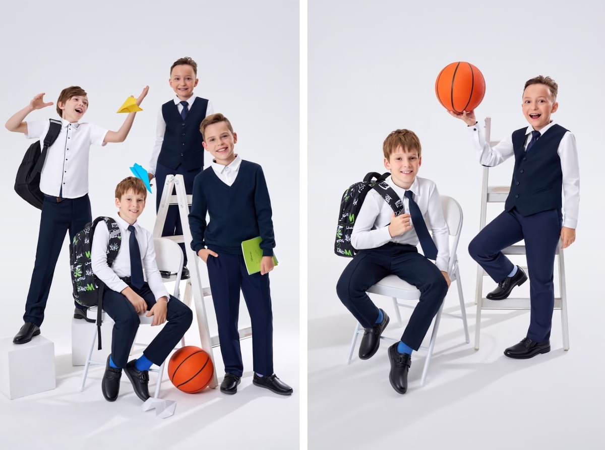 Детям непросто дается ношение формы. Особенно, когда они идут в школу впервые. Маленькие мальчики с нетерпением дожидаются, когда закончатся уроки и можно будет переодеться. Жилет для мальчиков синий, арт: 87509050. Рубашка для мальчиков с длинным рукавом белая, арт: 40609110. Школьные брюки для мальчиков синие, арт: 36909080. Галстук для мальчиков на резинке, арт: 56504010. Чтобы школьные будни проходили в комфорте, важно подобрать одежду, которая будет удобной, но в то же время подойдет под требования классного руководителя. Уточните, какие стандарты установлены в школе. Разумеется, ребенок привык к джинсам и спортивным штанам. Однако при правильном подборе брюки не будут мешать или передавливать. Пояс должен быть сшит по правильным параметрам.