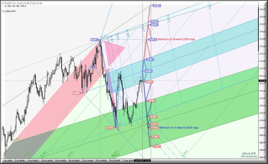 Развитие движения EUR/JPY-h4 c 08 августа 2025 года будет продолжено исходя из отработки и направления пробоя границ зоны равновесия (171.85 – 172.35 – 172.90) вил младшего операционного масштаба Minuette-h4