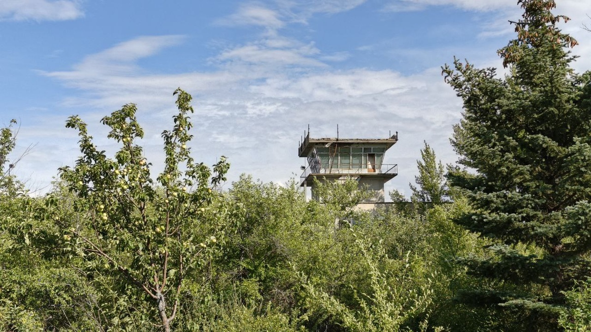 В аэропорт ведёт отходящая от трассы неширокое заросшее асфальтовое полотно, при подъезде к объекту встречающее шлагбаумом. Для нас он оказался открыт... Территория густо заросла деревьями и кустарником, природа берёт своё. Ещё издалека показалась диспетчерская - наш главный ориентир.