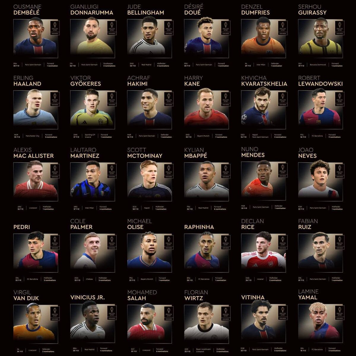 France Football опубликовал номинантов на «ЗМ». Смотрим 👀 30 кандидатов на «Золотой мяч», 10 номинантов на лучшего молодого игрока, премию Льва Яшина и пятерка лучших тренеров года. Вручение премии пройдет в Париже 22 сентября. Пиши в комментах, кто заберет награды 👇