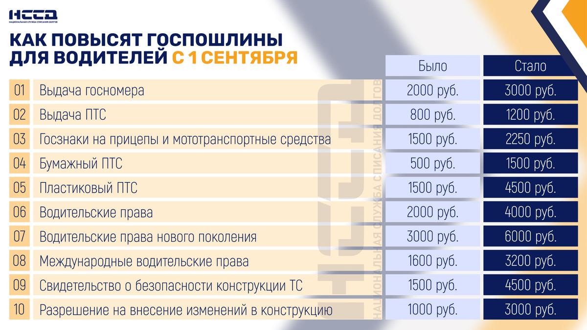 🚙 Памятка для автовладельцев Меньше чем через месяц, уже с 1 сентября, вырастут госпошлины для автомобилистов ❗️ ✅ Не забудьте сохранить и переслать знакомым водителям 📖 Статью о том, как сохранить имущество при банкротстве можно прочесть на нашем сайте https://nssd.su/blog/imushchestvo-pri-bankrotstve-fizicheskikh-lits-v-2025-godu-nssd/