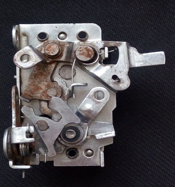 Первое лирическое отступление.Погуглив в интернете информацию по данной проблеме, я понял, что абсолютное большинство водителей, столкнувшихся с такой напастью, не понимают её причины. Кто-то советует смазывать замок двери маслом, кто-то – проливать «незамерзайкой». Одни говорят, что можно открыть заклинившую дверь работая ключом и с кнопки брелока одновременно, другие откровенно стебутся в ответ на просьбу помочь. Не правы все. Это чисто механическая неисправность. И чтобы более наглядно объяснить причину заклинивания замка, предлагаю взглянуть на фото этого механизма. Благо, старый свой замок я не выбросил, а оставил его в качестве «учебного пособия». Вот он и пригодился. На этом фото – замок в положении «ОТКРЫТО».