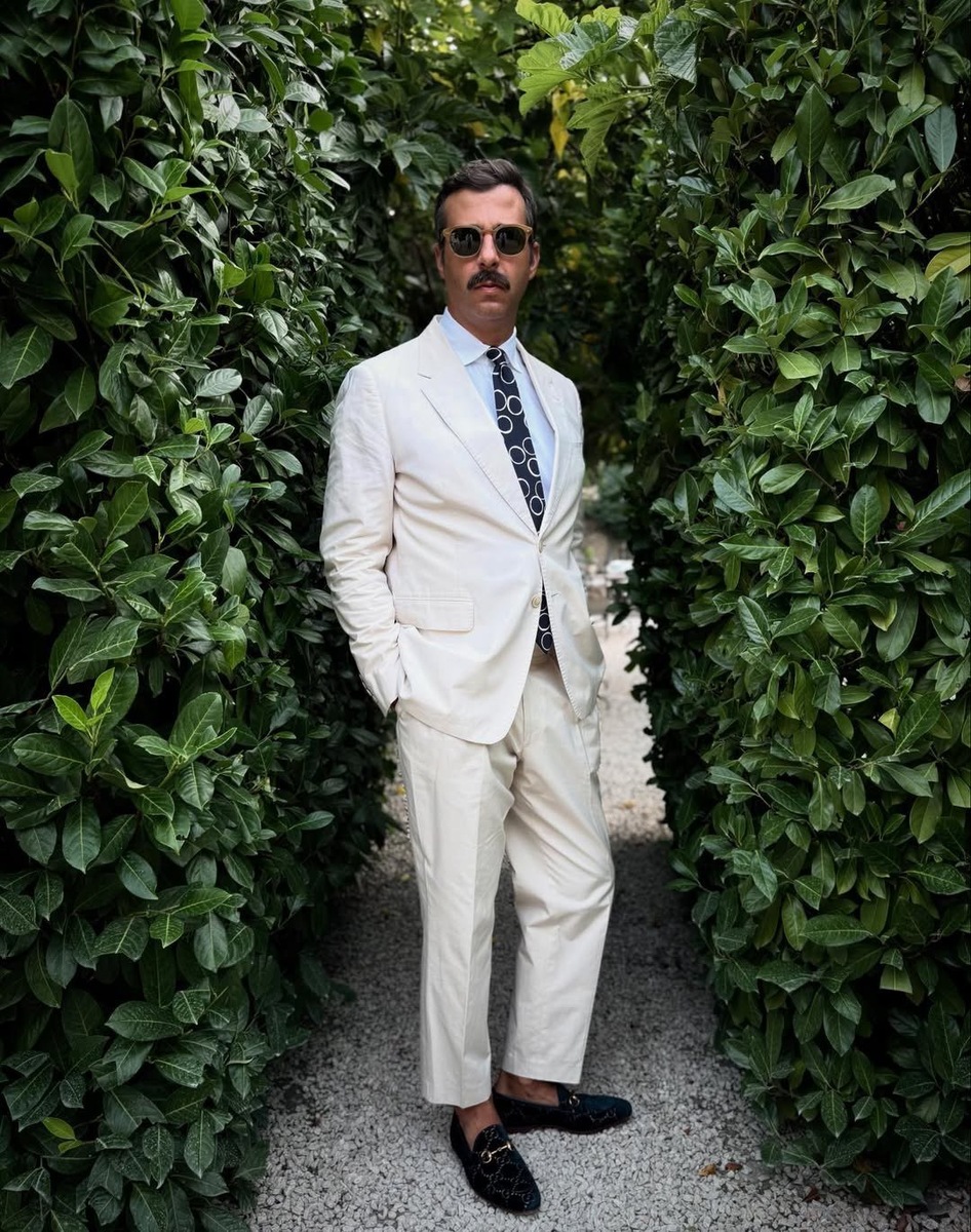 Иван Ургант в личном блоге разместил новое фото. Он позировал в белом костюме, светло-голубой рубашке, черном галстуке с узором и мокасинах.