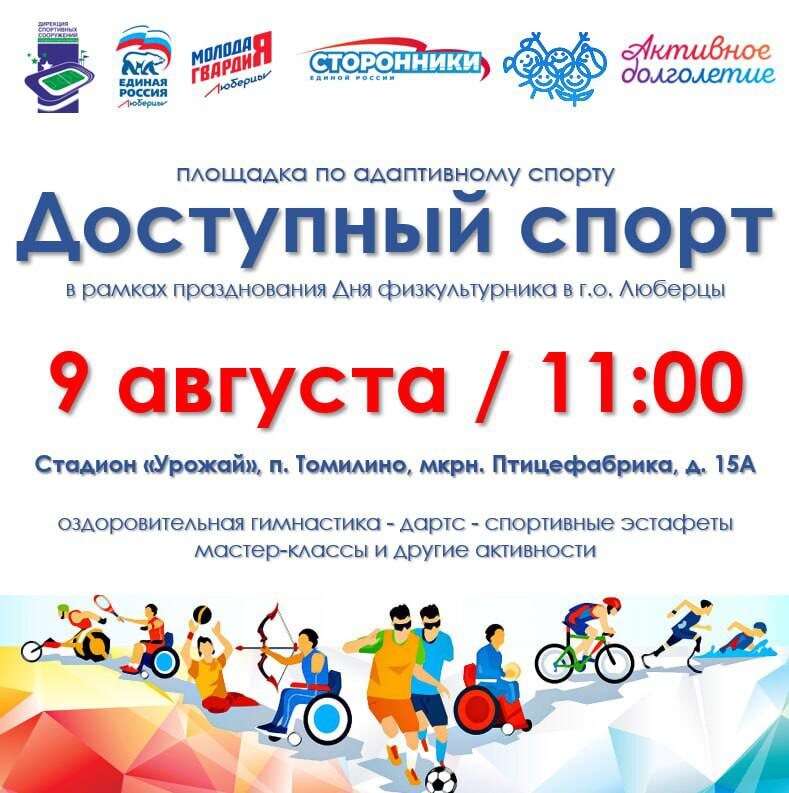♿️Доступный спорт на Дне физкультурника Приглашаем посетить площадку по адаптивному спорту на стадионе «Урожай» 🔵К участию приглашаем: - Дети и взрослые с инвалидностью - Люди старшего поколения - Дети и взрослые с особенностями здоровья 🔵Для вас проведем: - Оздоровительную гимнастику - Дартс - Спортивные эстафеты - Мастер-классы и другие активности 🔵Где и когда: 👉9 августа 👉10:30 старт регистрации (11:00 начало празднования) 👉Стадион «Урожай» (п. Томилино, мкрн. Птицефабрика, д. 15А) 🌞 Участие бесплатное! #ЕдинаяРоссия #ЕРЛюберцы #Подмосковье #Люберцы #ЕР50 #ЕРпроекты #СтаршееПоколение #ДетскийСпорт #ДостунаяСреда 👍 Единая Россия Люберцы