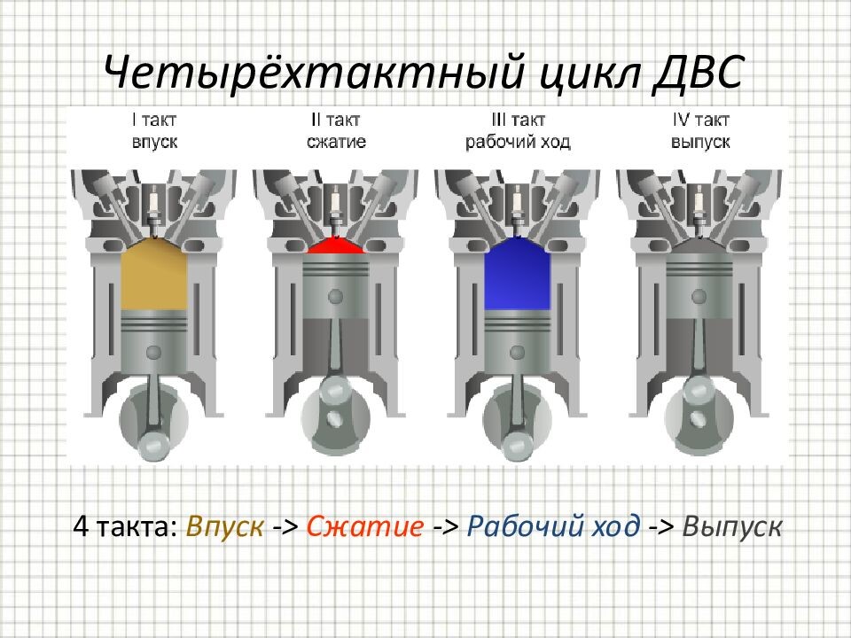 Концептуальная суть: Рабочий цикл совершается за два такта (один оборот коленвала).