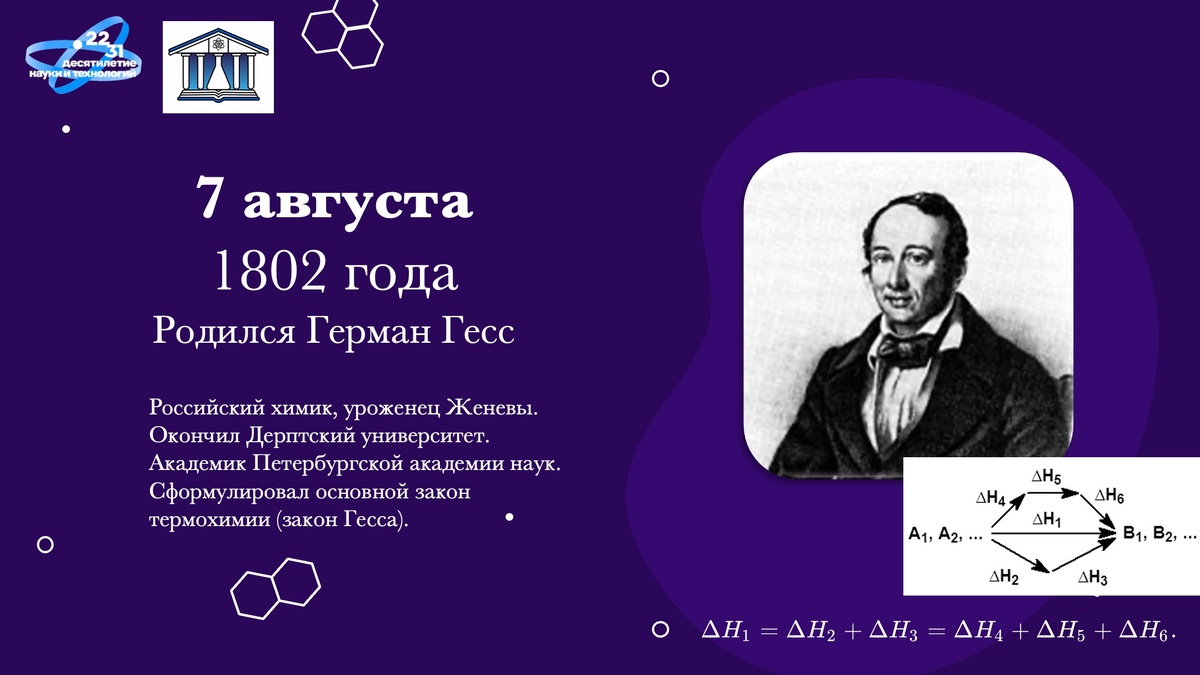 Сегодня и российская, и мировая химическая наука отмечает 222 года со дня рождения человека, родившегося в Женеве, отдавшего свою короткую — всего 48 лет — жизнь России, ставшего академиком в 28 лет, и за 20 с небольшим лет сделавшего очень много. Сегодня день рождения Германа Ивановича (Германа Генриха) Гесса. Гесс стажировался у Берцелиуса, работал в Иркутске врачом и одновременно изучал местные минералы, открыл четыре минерала (а потом в честь него назовут минерал гессит — теллурид серебра, из которого сам Гесс выделил теллур). Писал учебники, популяризировал химию, определял крепость спиртосодержащих напитков, преподавал в Горном институте и учил химии будущего Александра II, разрабатывал химическую номенклатуру. Но главное, он сумел распространить первое начало термодинамики на химические процессы. «Тепловой эффект химической реакции, проводимой в изобарно-изотермических или изохорно-изотермических условиях, зависит только от вида и состояния исходных веществ и продуктов реакции