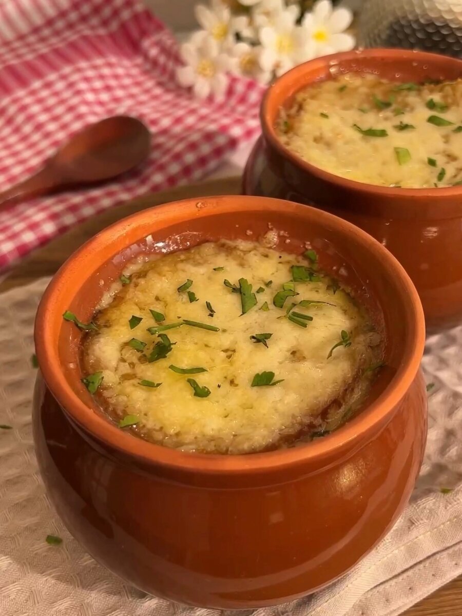 4. Суп разлить по горшочкам, сверху выложить ломтиками сыр, гренку и посыпать пармезаном. Запекать в духовке 10 минут.