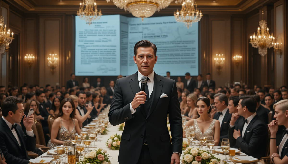 Наконец, пришла очередь Леонида. Он взял микрофон. В зале воцарилась тишина. Он обвел всех взглядом, остановившись на лицах Марины и Глеба. Они смотрели на него с улыбками победителей.