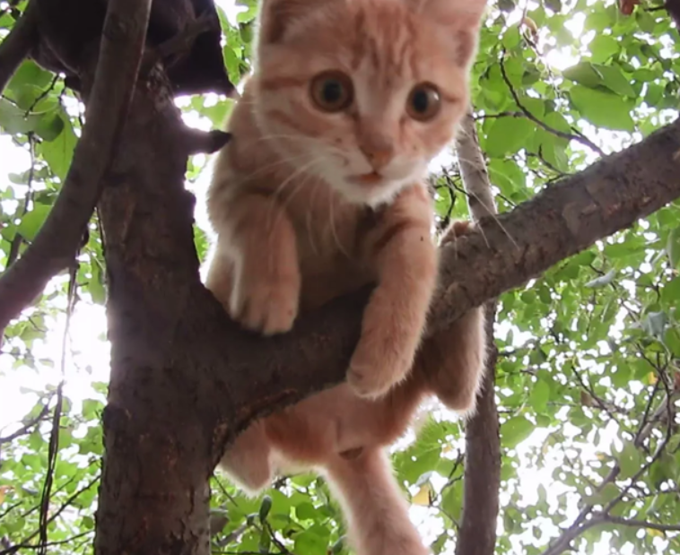 На старой яблоне, метрах в трёх от земли, висел крошечный рыжий котёнок.