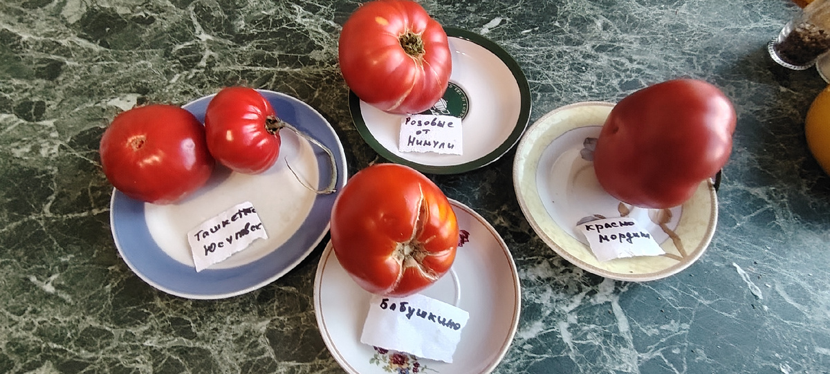 Здравствуйте, мои дорогие подписчики и гости. Сегодня у нас была дегустация помидор и ужин одновременно. Участвовали следующие сорта томатов: Ташкентский Юсуповский, Розовые от Нинули, Бабушкино, Красномордина. Внешне мне больше всех помидорка сорта Красномордина понравилась. Это томаты в разрезе. Очень хотелось попробовать сорт Розовые от Нинули. Я несколько лет назад заказывала его у Ольги, канал Огородник из Рязани. Вот он и дождался своей очереди. Вкусом Розовые от Нинули не удивили. Оказались пресными. Мякоть сочная, мягкая. Но нет выраженного вкуса. Красномордина мне очень понравилась и на разрезе. Зелёное пятно было только у плодоножки. Мякоть ярко красная, маслянистая. Вкус с кислинкой, в меру сладкий, насыщенный, томатный. Шкурку я не почувствовала. Очень вкусные помидорки. Следом взяла кусочек от помидорки сорта Ташкентский Юсуповский. Он тоже не подвёл. Изумительно гармоничный насыщенный вкус у помидорки, с нежной сочной мякотью. Какой из сортов вкуснее затрудн