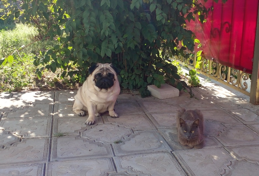 Дорогой дневник! Времена сейчас тяжелые, капитализм за окном, каждый выживает как может и пытается сам зарабатывать деньги. Вот и мы с котом Серым решили организовать свой маленький, но бизнес. Частную лавочку - как говорили раньше. Это мы с напарником на своем рабочем месте. Во дворе возле калитки. Нет, мы не устроились в частное охранное предприятие (ЧОП), я уже пробовал себя в этом дела, не пошло у меня. Хозяин сказал, что охраннику нужно жить в будке, а у меня ревматизм и очень крепкий сон. Очень крепкий. Уносили 2 раза... Мы решили заняться попрошайничеством вымогательством ... хитрым отъемом еды на добровольных началах. Рассказываю поподробнее. Вариант 1. В калитку заходит клиент (человек). К нему из кустов выбегаю я, злой мопс со звериным оскалом и грозным рыком! Клиент от страха и ужаса приседает на дрожащих ногах и такими же руками достает из пакета еду. Ну, вкусняшки там разные, мы с котом все утро работали и составляли их список. Забрав добычу, мы с Серым скрываемся в зарос