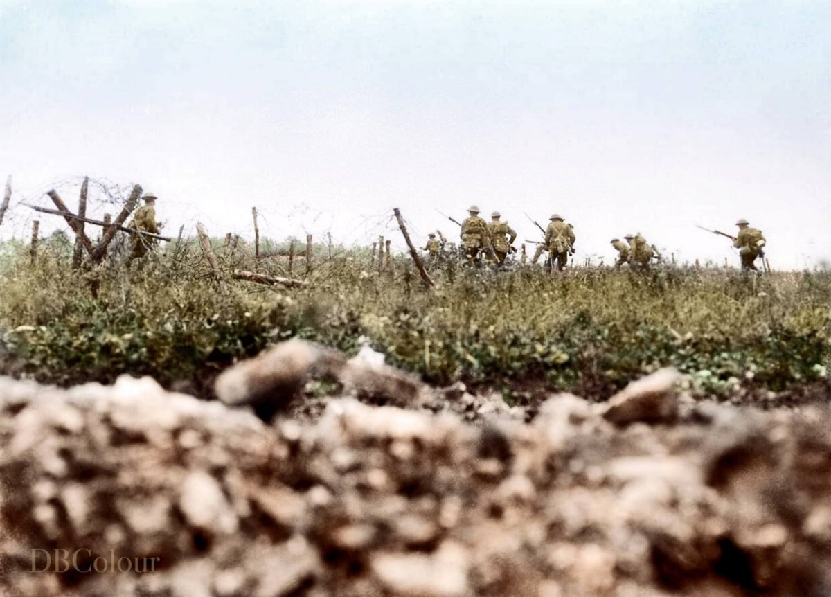 Солдаты Уилтширского полка продвигаются вперед через загрождения на ничейной земле, Типваль, 7 августа 1916 года