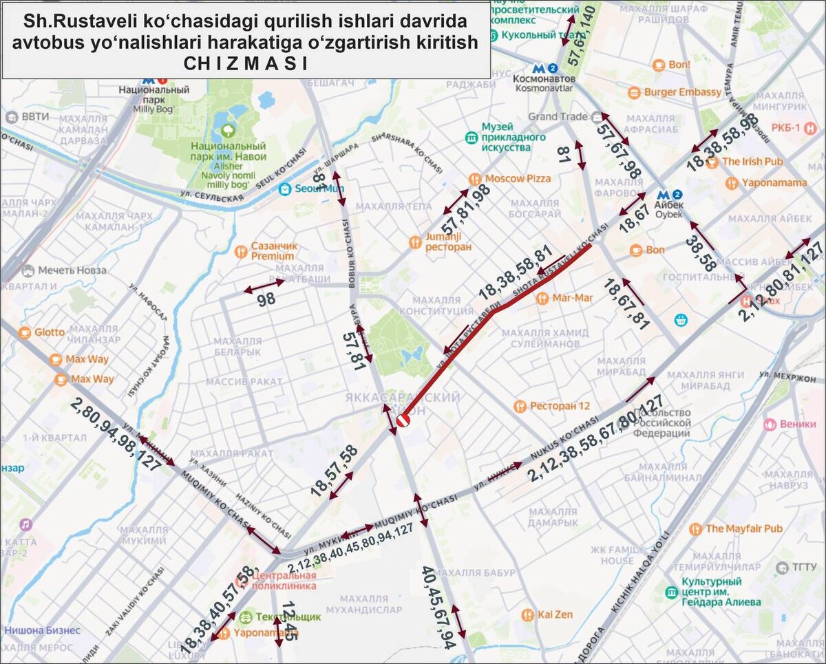 Toshkent shahar Shota Rustaveli ko‘chasining Grand Mir mehmonxonasidan Bobur ko‘chasigacha qismida avtobus yo‘nalishlari harakati vaqtincha